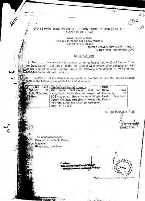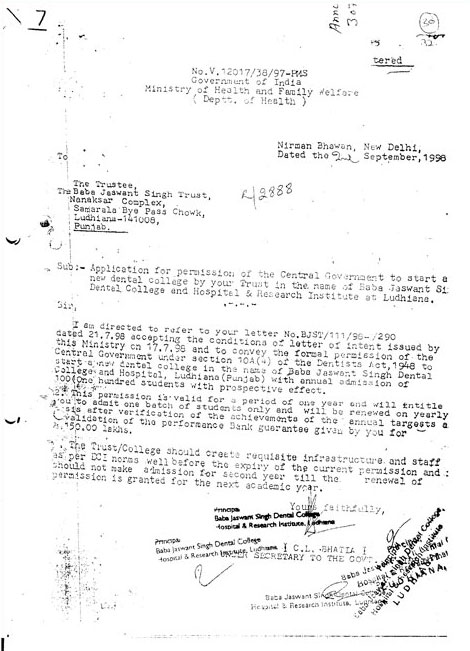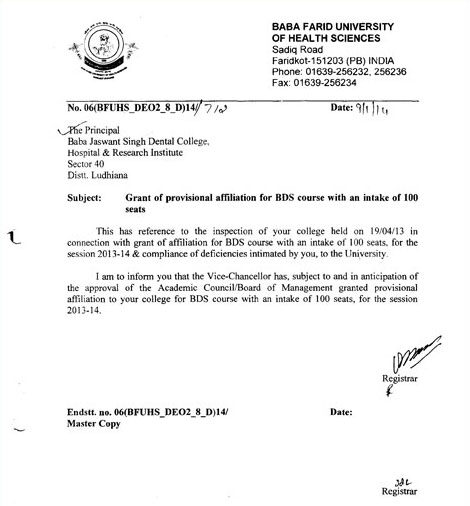 Affiliation for BDS course with an intake of 100 seats from BFUHS, Faridkot